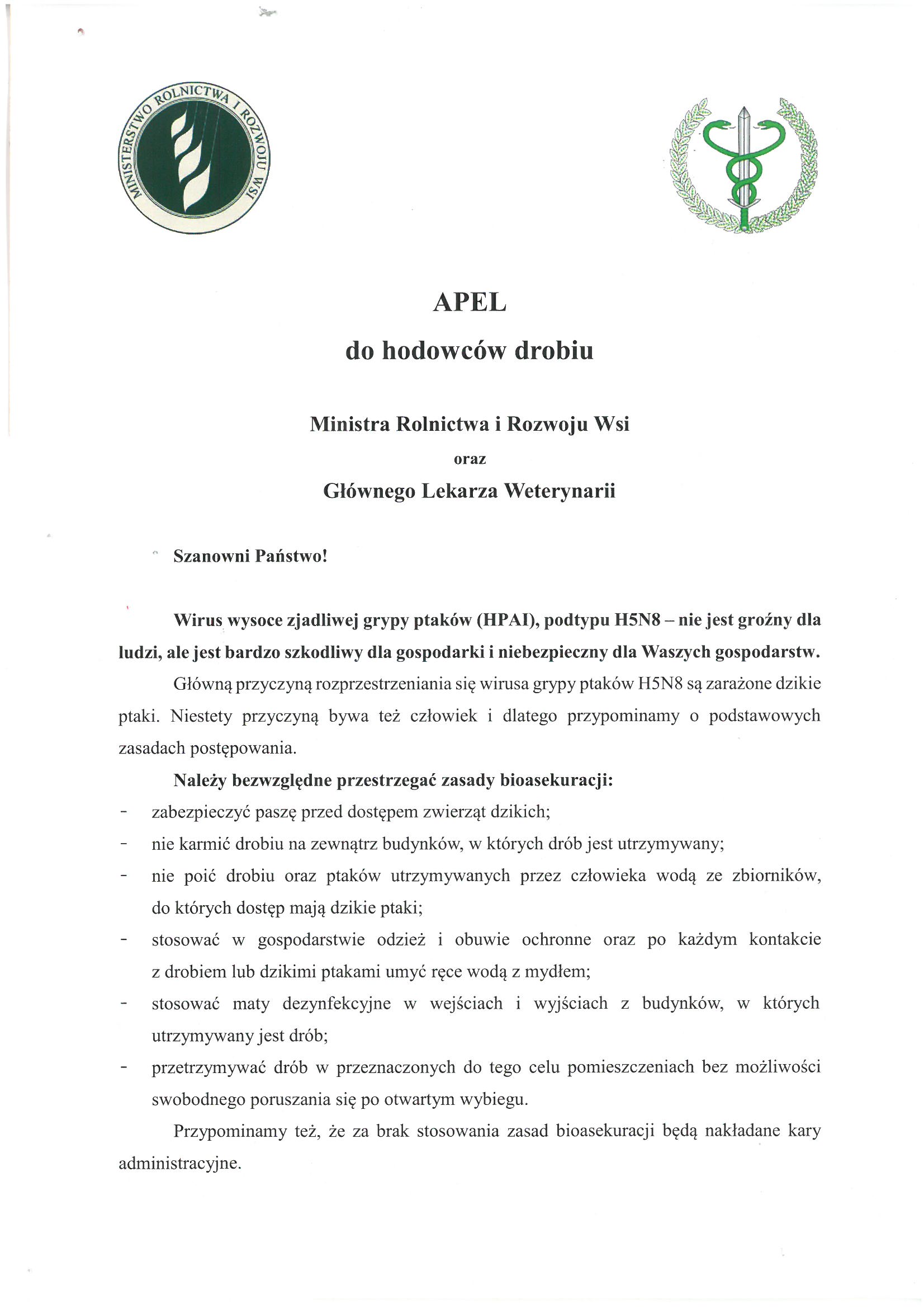 Apel do hodowców drobiu Ministra Rolnictwa i Rozwoju Wsi oraz Głównego Lekarza Weterynarii