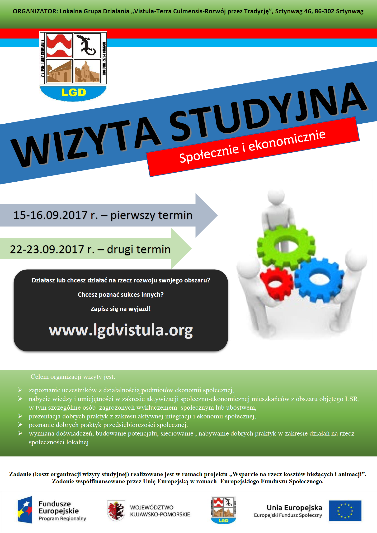 Lokalna Grupa Działania "Vistula-Terra Culmensis" organizuje w terminach: 15-16 września 2017 r. oraz 22-23 września 2017 r. wizyty studyjne prezentujące działalność podmiotów ekonomii społecznej, działania wspierające rozwój gospodarki społecznej i przedsiębiorczości społecznej, działania z zakresu aktywizacji społeczno-zawodowej, działania z obszaru aktywnej integracji, w tym działania animacyjne. Celem organizacji wizyty studyjnej jest: zapoznanie uczestników z działalnością podmiotów ekonomii społecznej, nabycie wiedzy i umiejętności w zakresie aktywizacji społeczno-ekonomicznej mieszkańców z obszaru objętego LSR, w tym szczególnie osób zagrożonych wykluczeniem społecznym lub ubóstwem, prezentacja dobrych praktyk z zakresu aktywnej integracji i ekonomii społecznej, poznanie dobrych praktyk przedsiębiorczości społecznej, wymiana doświadczeń, budowanie potencjału, sieciowanie, nabywanie dobrych praktyk w zakresie działań na rzecz społeczności lokalnej. Uczestnikami zadania mogą być osoby, podmioty z obszaru działania LGD „Vistula-Terra Culmensis” chcących nabyć wiedzę i umiejętności w zakresie animowania społeczności lokalnej z obszaru działania LGD „Vistula-Terra Culmensis”, w zakresie prowadzenia działań na rzecz osób zagrożonych ubóstwem i wykluczeniem społecznym z obszaru działania LGD „Vistula-Terra Culmensis”, w zakresie prowadzenia podmiotów ekonomii społecznej na obszarze działania LGD „Vistula-Terra Culmensis”. Zapoznaj się z zasadami udziału w zadaniu, w tym z zasadami rekrutacji.