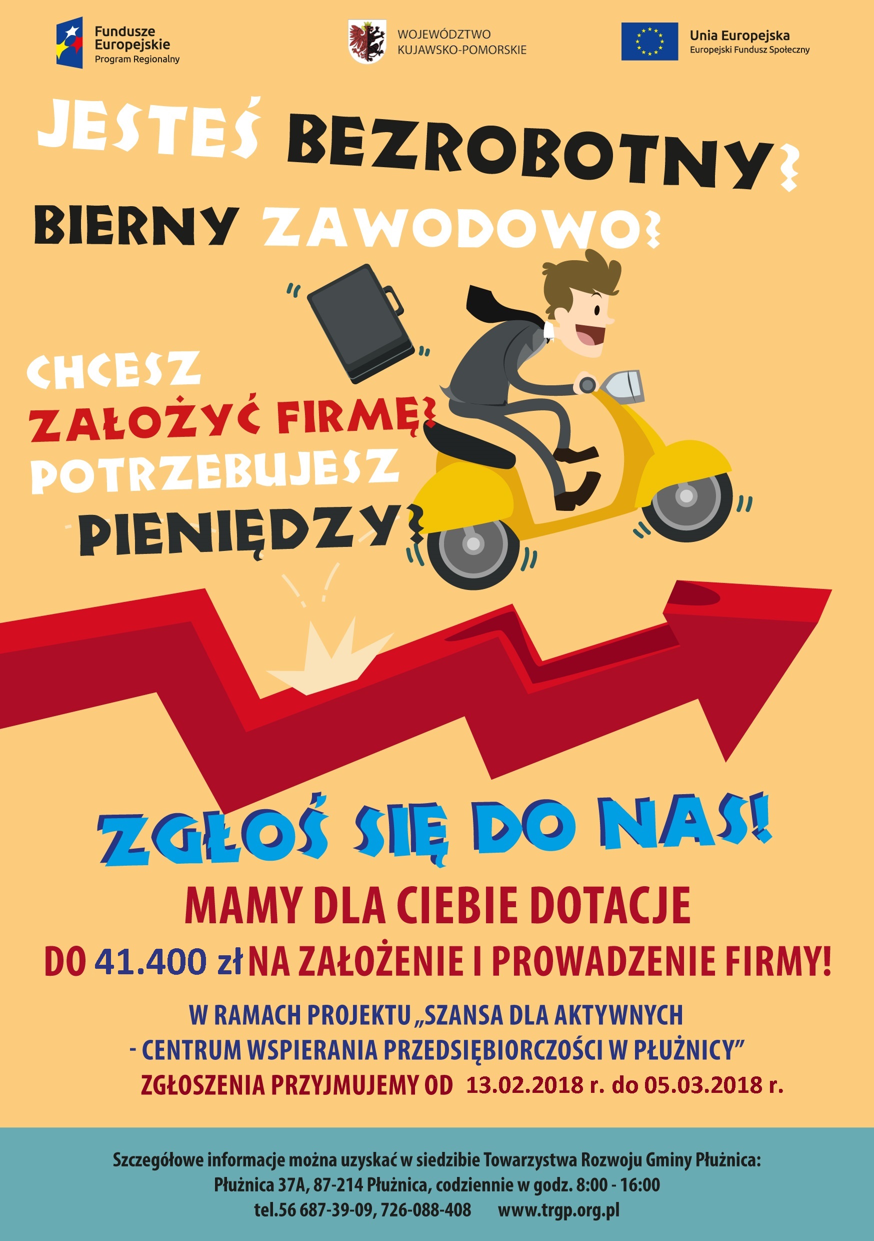 Stowarzyszenie Towarzystwo Rozwoju Gminy Płużnica informuje, że od 13.02.2018 r. do 05.03.2018 r roku trwa VI nabór do projektu „Szansa dla Aktywnych - Centrum Wspierania Przedsiębiorczości w Płużnicy”.