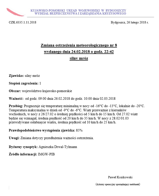 Komunikat Wojewódzkiego Centrum Zarządzania Kryzysowego w sprawie mrozów.