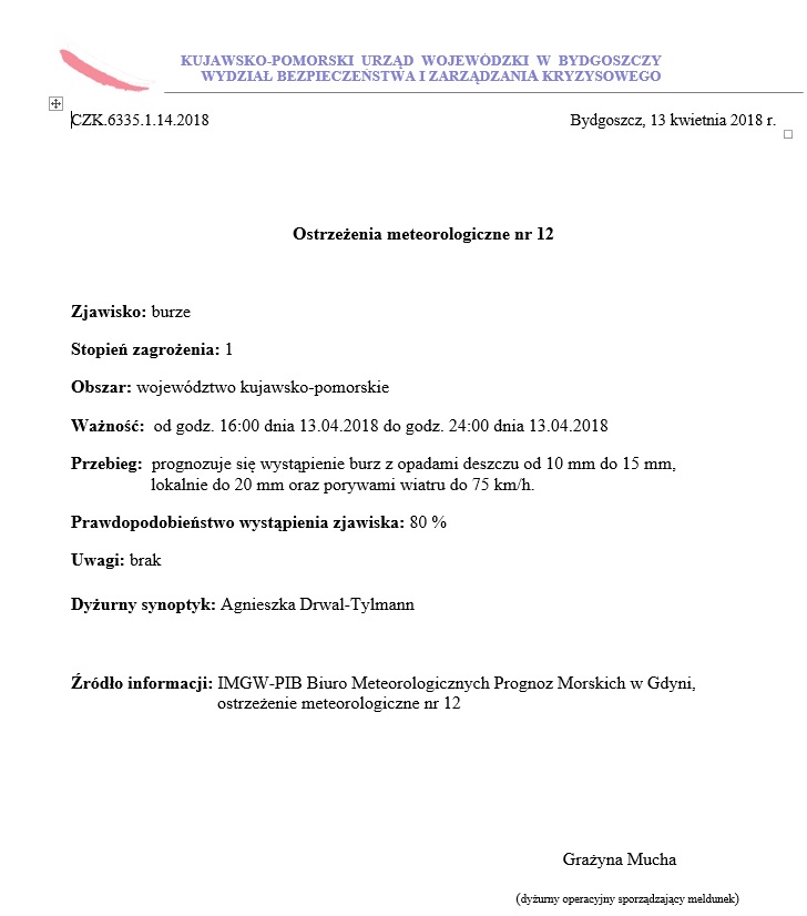 Komunikat Wojewódzkiego Centrum Zarządzania Kryzysowego w sprawie wystapienia burz