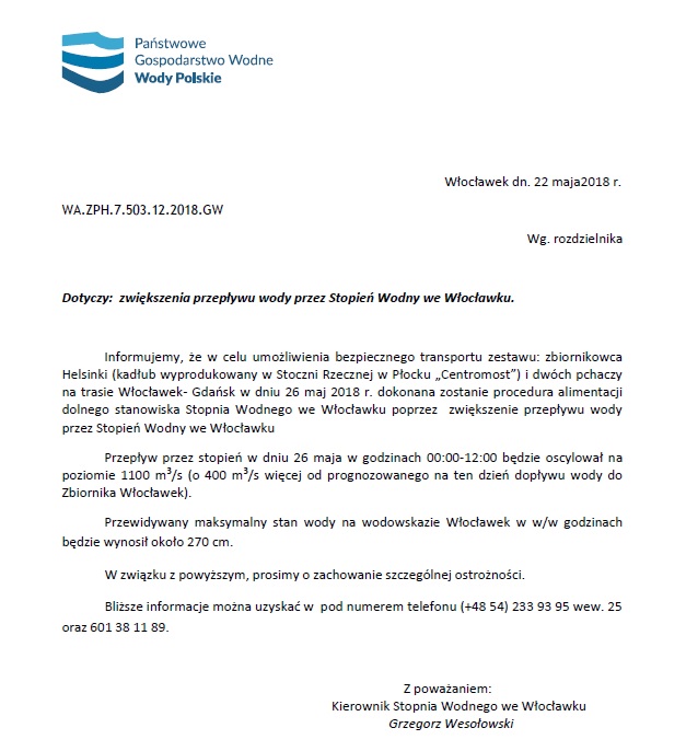 Zwiększenie przepływu wody przez Stopień Wodny we Włocławku.