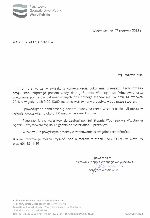 Informacja na temat wstrzymania przepływu wody w rzece Wiśle.
