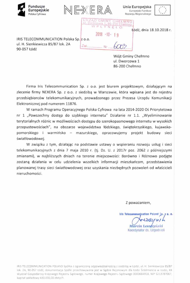 Informacja na temat budowy sieci światłowodowej w miejscowościach Borówno i Różnowo.