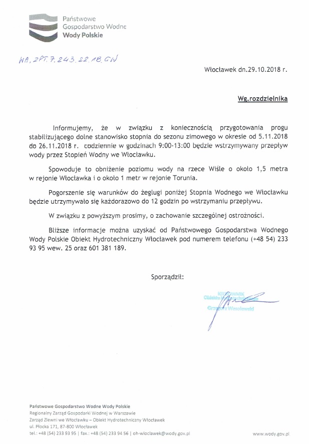 Wstrzymywanie przepływu wody w dniach 05.11 – 26.11.2018