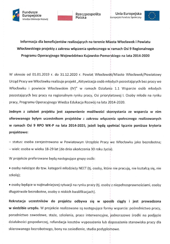 Informacja dla beneficjentów realizujących na terenie Miasta Włocławek i Powiatu Włocławskiego projekty z zakresu włączenia społecznego w ramach Osi 9 RPO.