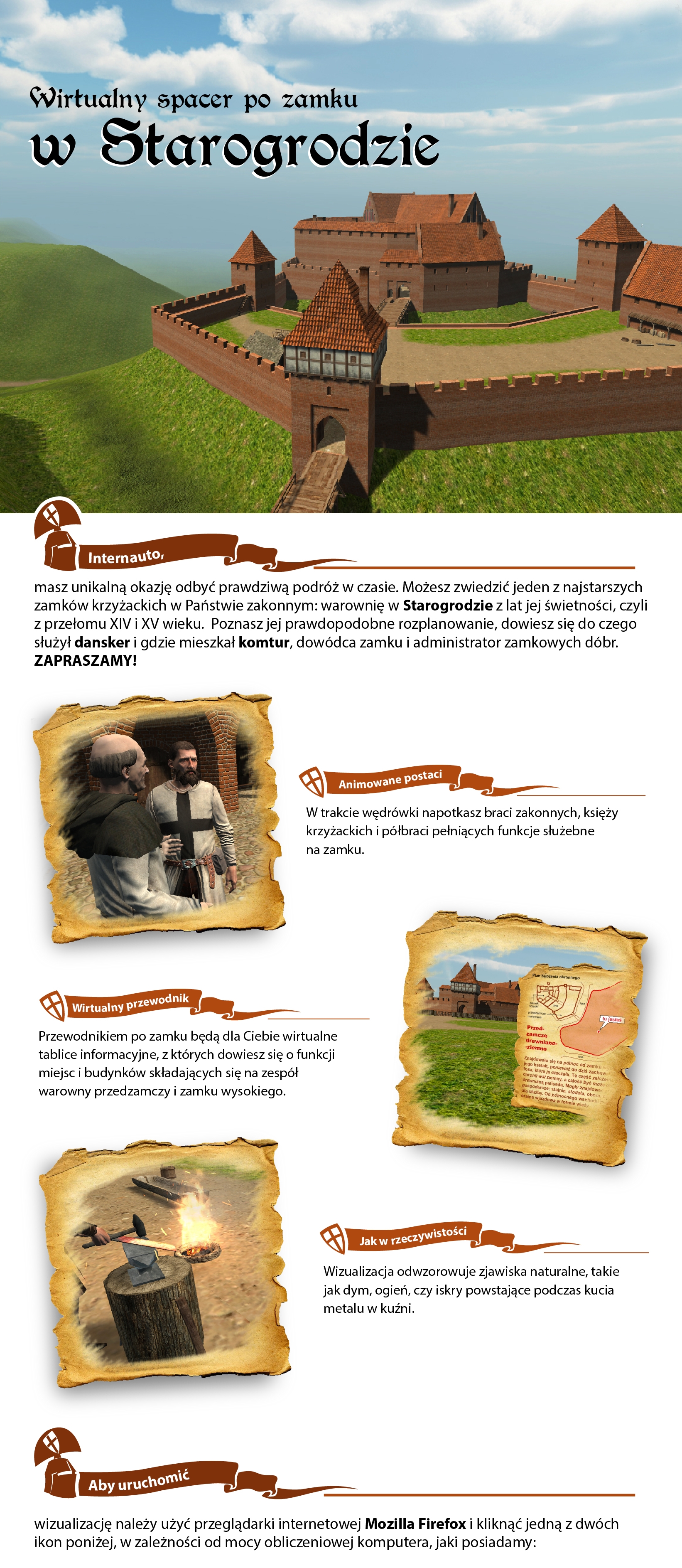 W połowie XIII w. mistrz Zakonu Krzyżackiego Herman von Balk zbudował gród warowny – drewniany, który kilkanaście lat później zastąpiono zamkiem murowanym. Gród składał się z zamku właściwego zbudowanego na planie pięcioboku i dwóch podzamczy usytuowanych od północy i oddzielonych fosami. Ogromne wrażenie robiła kaplica zamkowa. Zamek był siedzibą mistrzów krajowych, a następnie komturów. Głównym zadaniem zamku była ochrona pobliskiego Chełmna przed najazdami. W 1240 roku w kaplicy zamkowej umieszczono relikwię św. Barbary. Z tego powodu zamek stał się miejscem licznych pielgrzymek. Do kaplicy pielgrzymowali m.in. król czeski Wacław oraz Anna żona wielkiego księcia litewskiego Witolda. Od początku XV w. zamek stał się własnością biskupów chełmińskich. W 1623 roku zamek wizytował król Zygmunt III Waza.