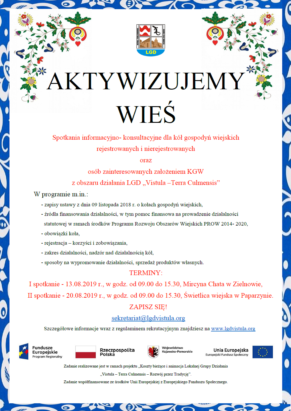 Wszystkich mieszkańców obszaru działania LGD "Vistula - Terra Culmensis" działających już w kole lub chcących założyć koło gospodyń wiejskich zapraszamy do wzięcia udziału w spotkaniach informacyjno- konsultacyjnych, które pozwolą uzyskać lub poszerzyć wiedzę niezbędną do założenia i prowadzenia koła gospodyń wiejskich.