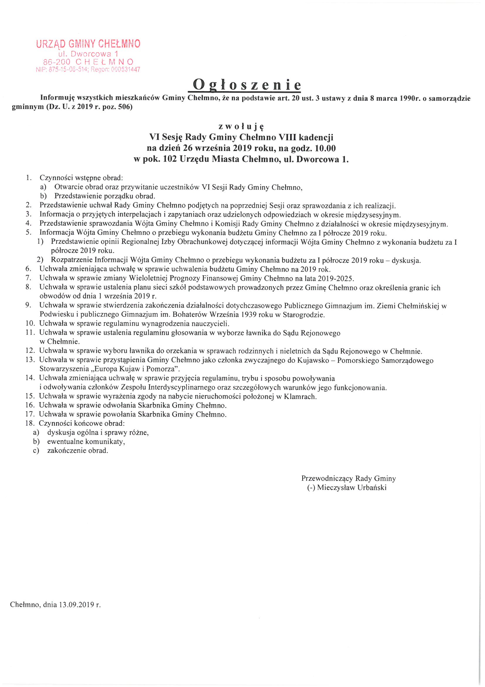 Ogłoszenie w sprawie zwołania VI Sesji Rady Gminy Chełmno na dzień 26 września 2019 r.