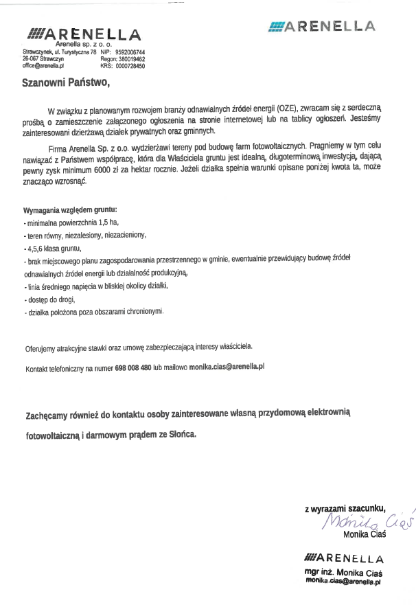 Informacja o dzierżawie działek prywatnych lub gminnych po budowę farm fotowoltaicznych