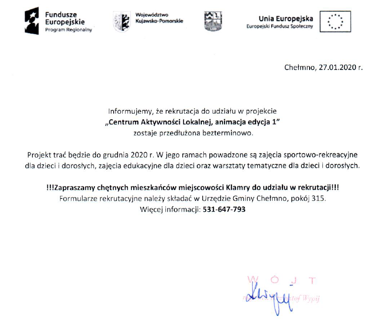 Informacja o przedłużeniu rekrutacji do projektu "Centrum Aktywności lokalnej, animacja edycja 1"