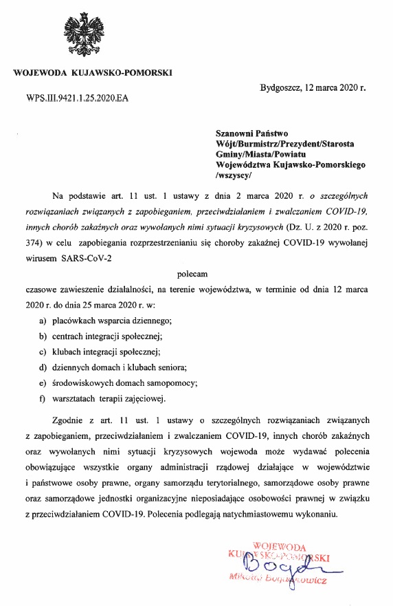 Komunikat Wojewody Kujawsko-Pomorskiego z dnia 12.03.2020 r.