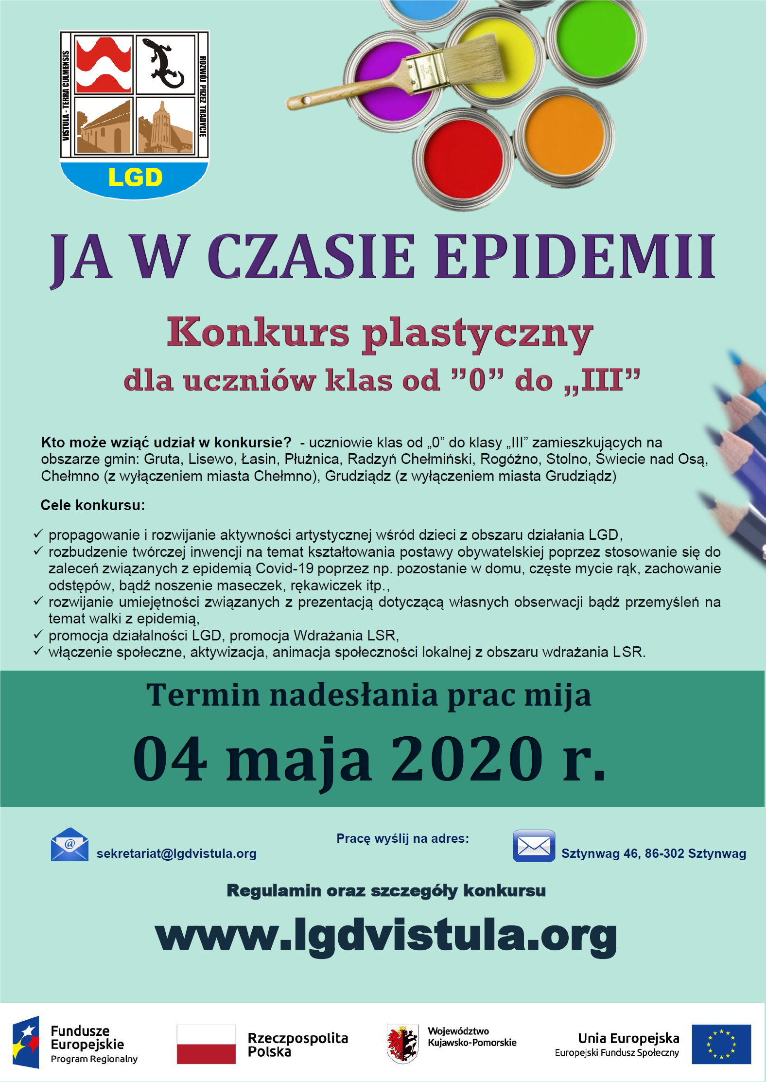 "Zarząd LGD "Vistula-Terra Culmensis" zaprasza dzieci dzieci z klas od „ 0 ” do „III”, które zamieszkują teren działania LGD „Vistula-Terra Culmensis” tj. mieszkają na terenie jednej z wiejskich gmin: Grudziądz, Gruta, Łasin, Radzyń Chełmiński, Rogóźno, Świecie nad Osą, Chełmno, Lisewo, Stolno, Płużnica do wzięcia udziału w konkursie plastycznym. Termin składania prac mija: 04 maja 2020 r. Zapoznaj się z Regulaminem konkursu. "