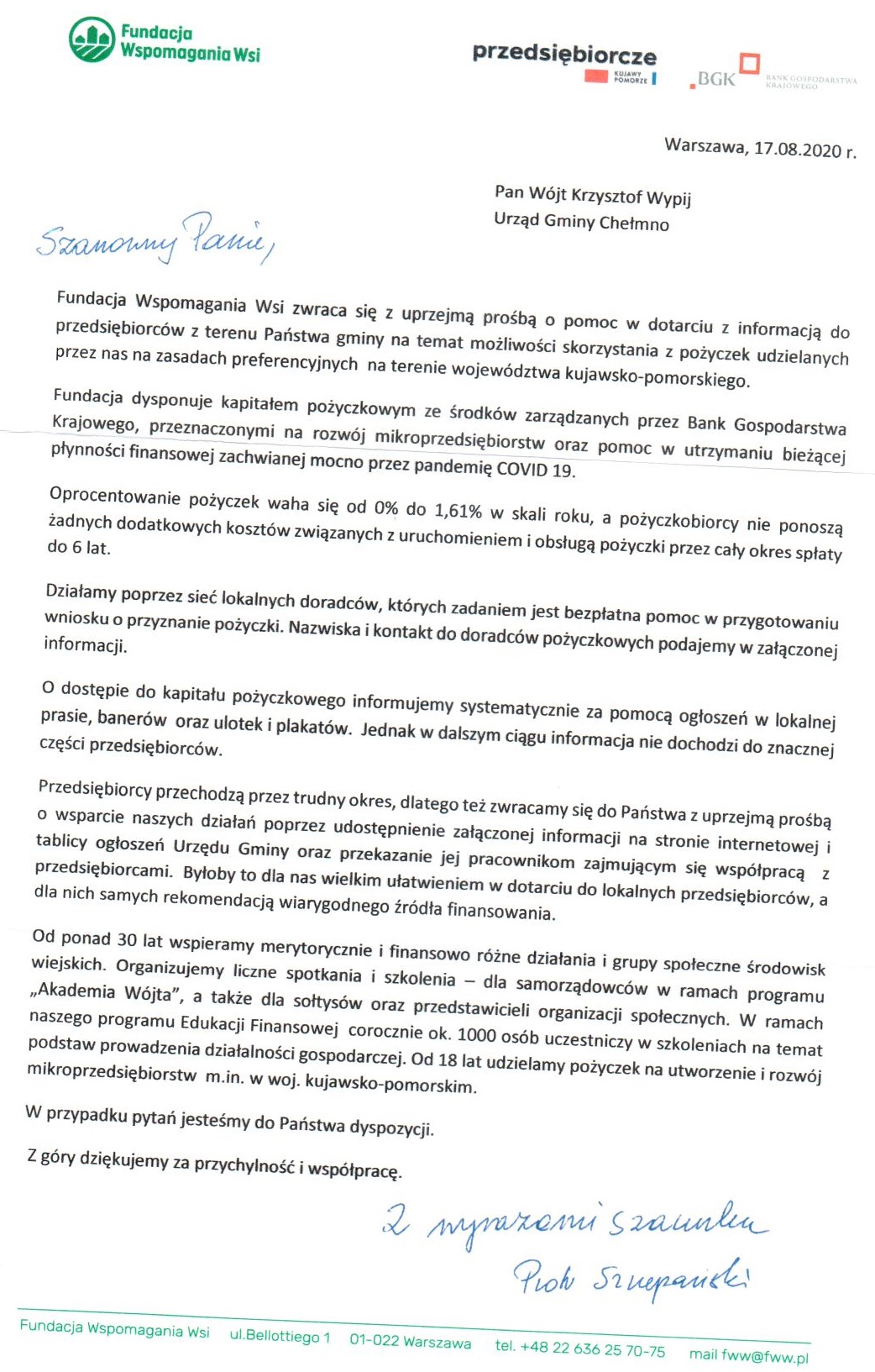 Pismo Fundacji wspomagania wsi w sprawie pożyczek dla przedsiębiorców