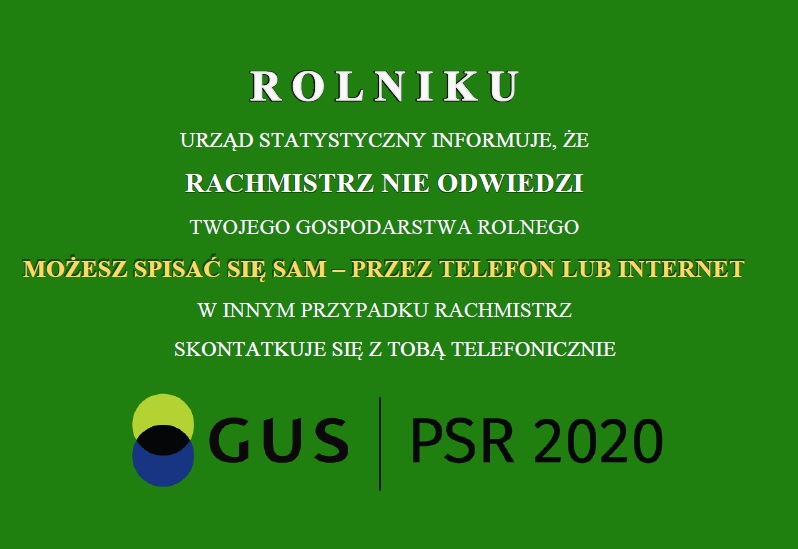 Informacja Urzędu Statystycznego w Bydgoszczy dotycząca Powszechnego Spisu Rolnego 2020. Z powodu sytuacji epidemicznej rachmistrz nie odwiedzi gospodarstwa rolnego. Należy się spisać samemu, w przypadku braku samospisu Rachmistrz skontaktuje się z właścicielem gospodarstwa telefonicznie.