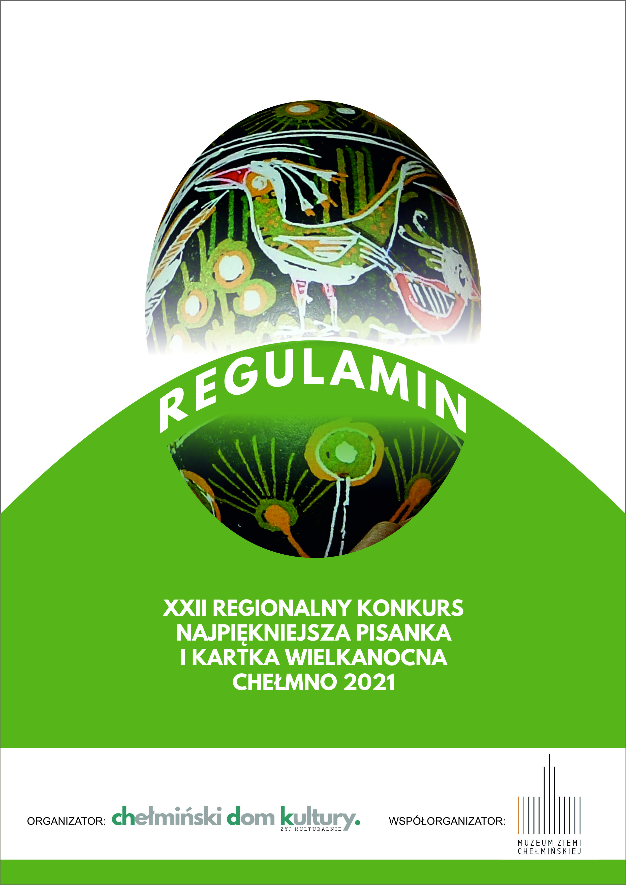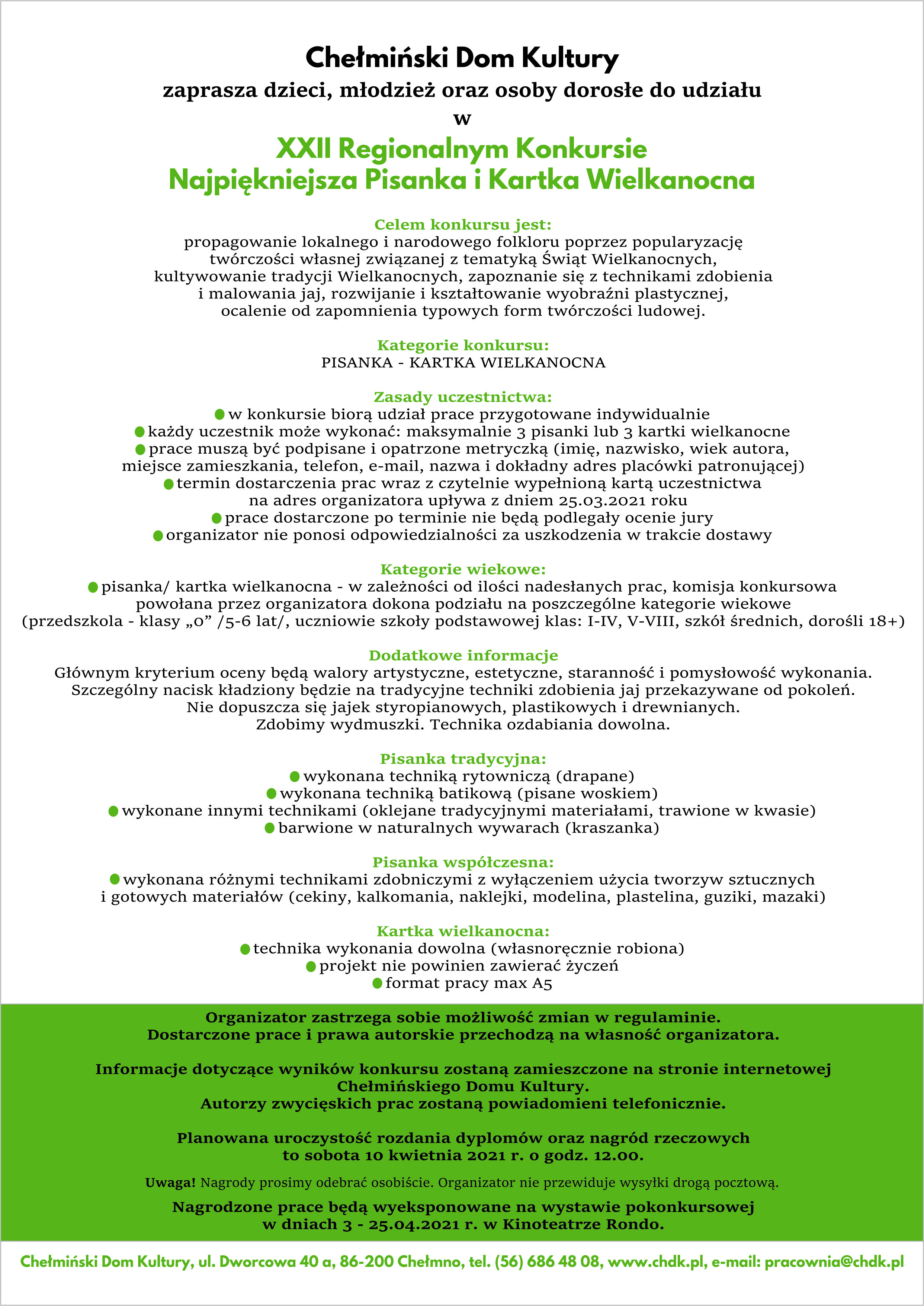 Celem konkursu jest propagowanie lokalnego i narodowego folkloru poprzez popularyzację twórczości własnej oraz kultywowanie Świąt Wielkanocnych. Głównym kryterium oceny będą walory artystyczne, estetyczne, staranność i pomysłowość wykonania, mile widziane tradycyjne techniki zdobienia jaj przekazywane od pokoleń. W ramach konkursu można zgłosić: pisankę tradycyjną, pisankę współczesną lub kartkę wielkanocną. Zasady uczestnictwa i dodatkowe informacje dostępne są na stronie www.chdk.pl w zakładce Aktualności.
