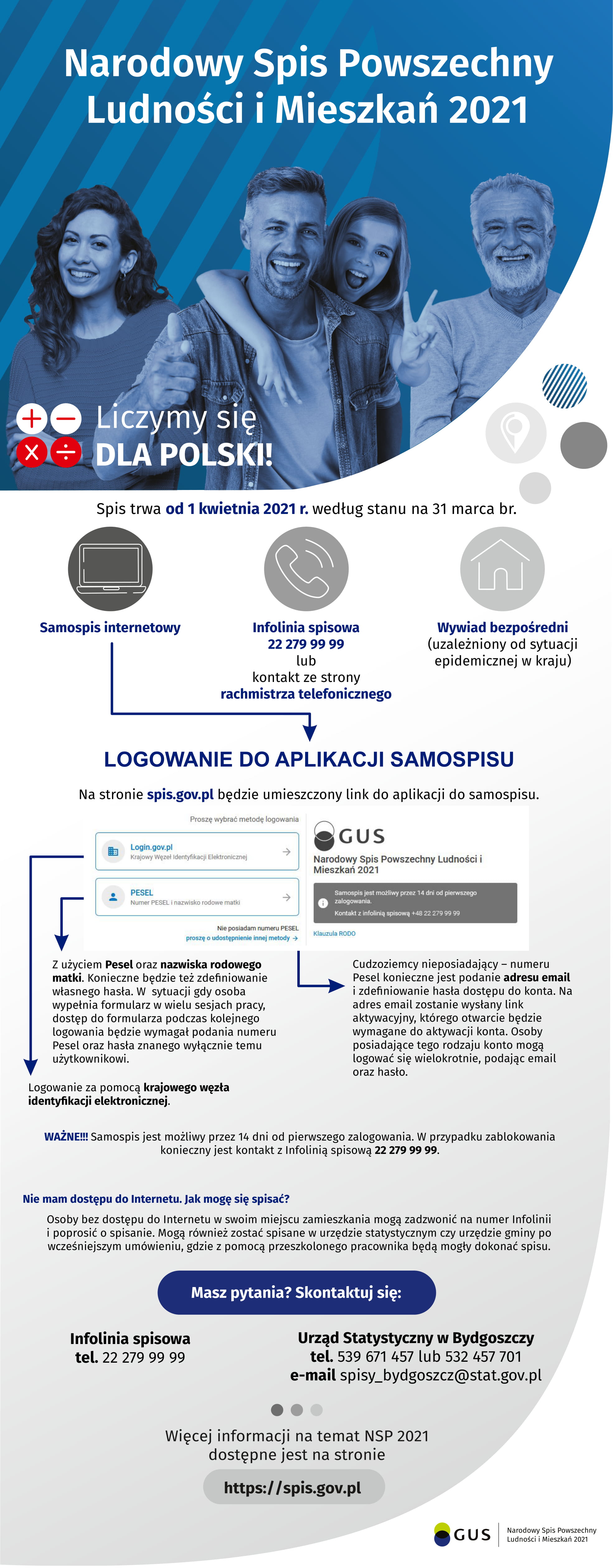Przypominamy, że już za 3 dni, tj. 1 kwietnia 2021 r., rozpoczyna się Narodowy Spis Powszechny Ludności i Mieszkań 2021. Zanim zadzwoni rachmistrz, możemy spisać się SAMODZIELNIE przez TELEFON lub INTERNET.