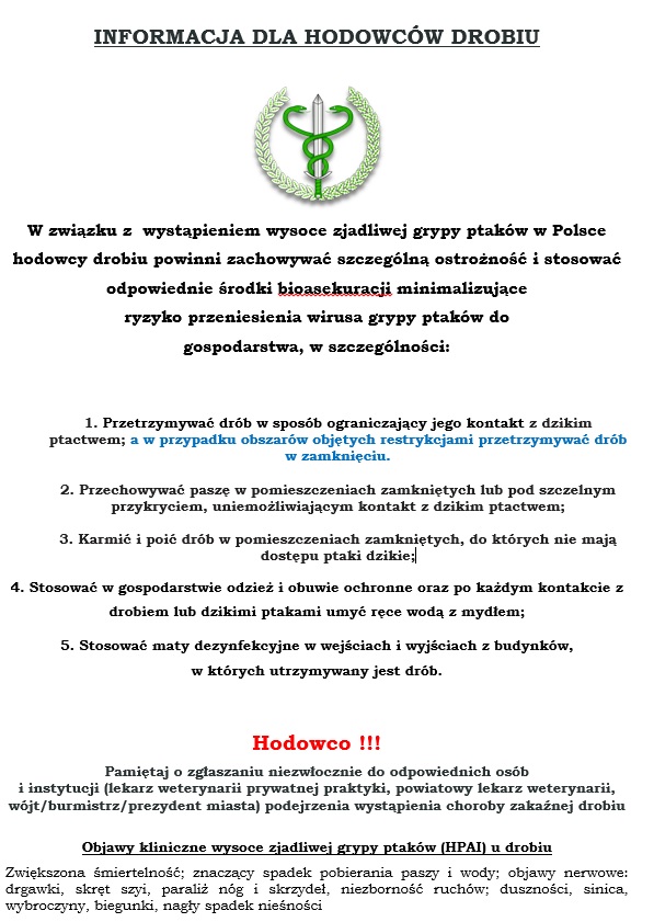 INFORMACJA DLA HODOWCÓW DROBIU – Nowe Rozporządzenie Nr 12/2021 Wojewody Kujawsko – Pomorskiego z dnia 19 kwietnia 2021 r.