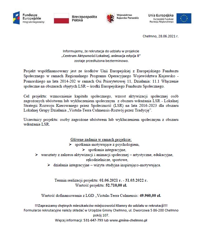Informacja o przedłużeniu rekrutacji do projektu "Centrum Aktywności Lokalnej, animacje edycja II"