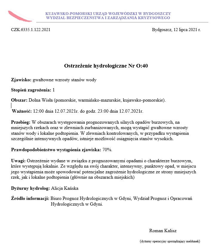 Ostrzeżenie hydrologiczne z dnia 12.07.2021 r.