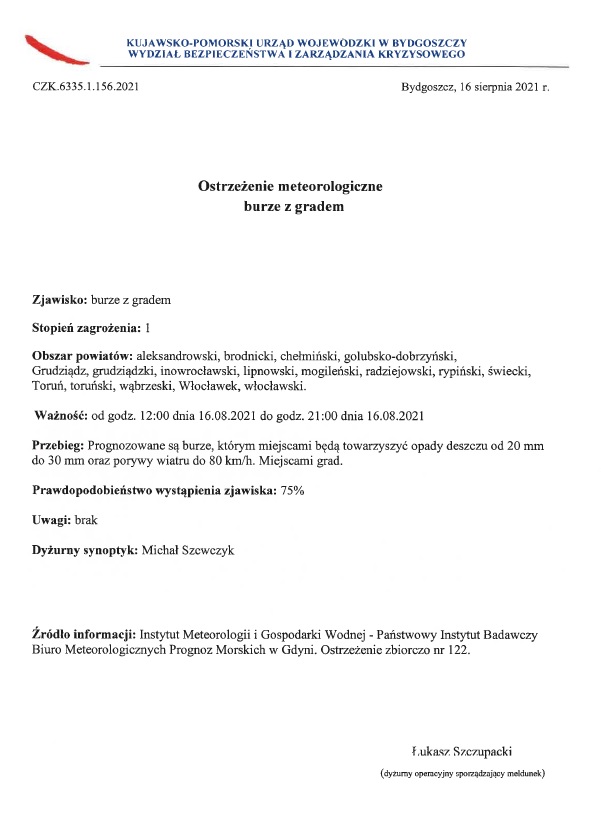 Ostrzeżenie meteorologiczne o burzach z gradem.