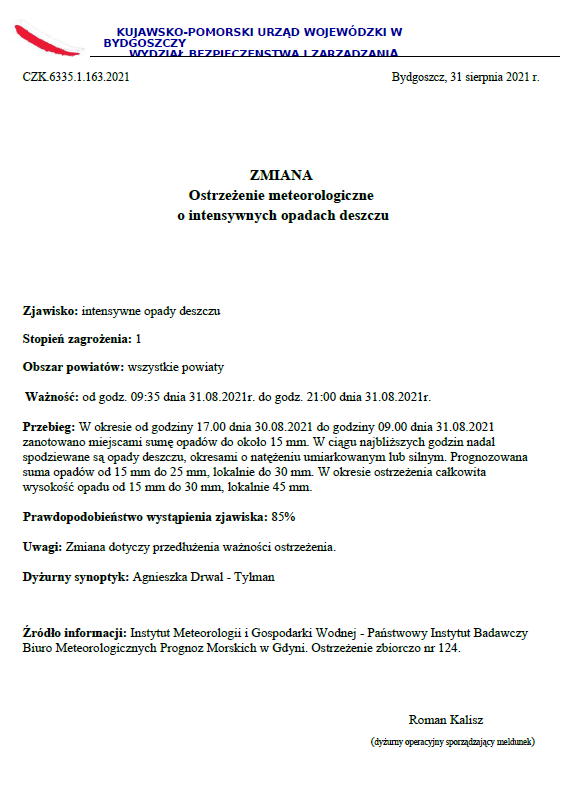 Ostrzeżenie meteorologiczne o intensywnych opadach deszczu