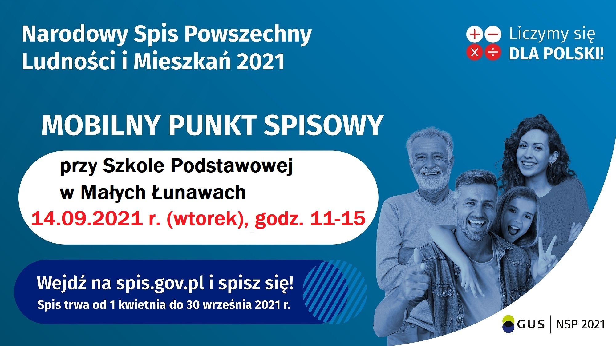 Dlatego już we wtorek (14.09.2021 r.) zapraszamy wszystkich mieszkańców, którzy jeszcze nie dopełnili obwiązku spisowego do Mobilnego punktu spisowego przy Szkole Podstawowej w Małych Łunawach.