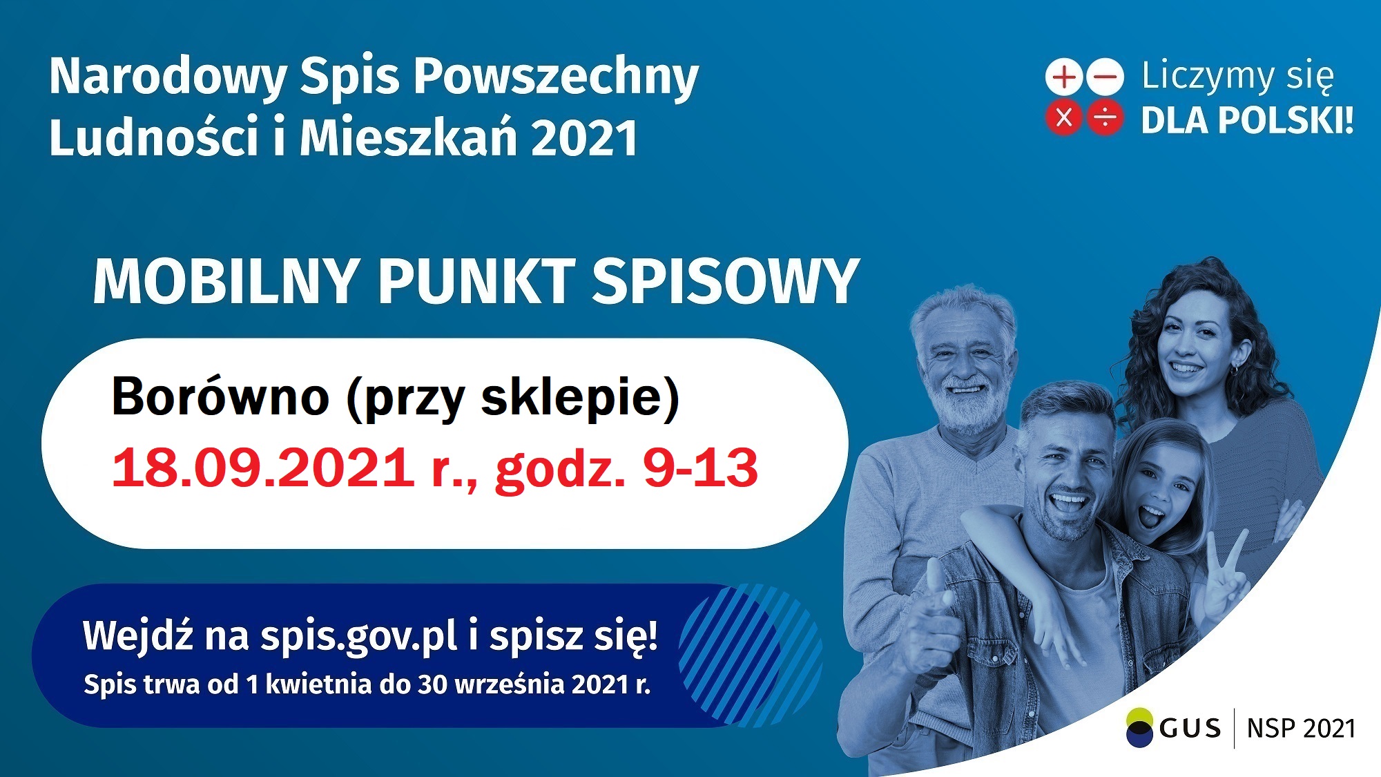 Mobilny Punk Spisowy w Borównie. Sobota 18.09.2021 r., godz. 9-13. Zapraszamy!!!