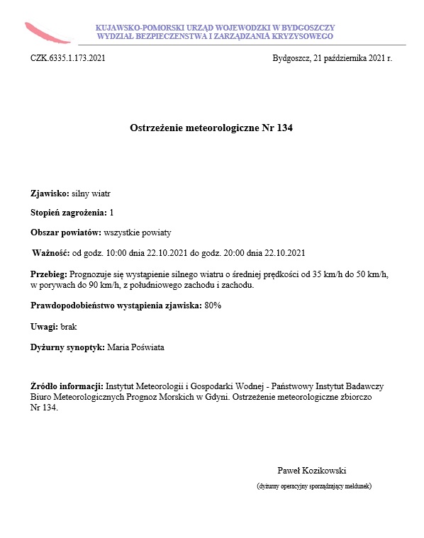 Ostrzeżenie meteorologiczne z dnia 22.10.2021 r.- silny wiatr.