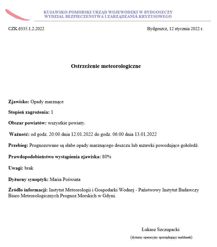 Ostrzeżenie meteorologiczne z dnia 12.01.2022 r. - opady marznące