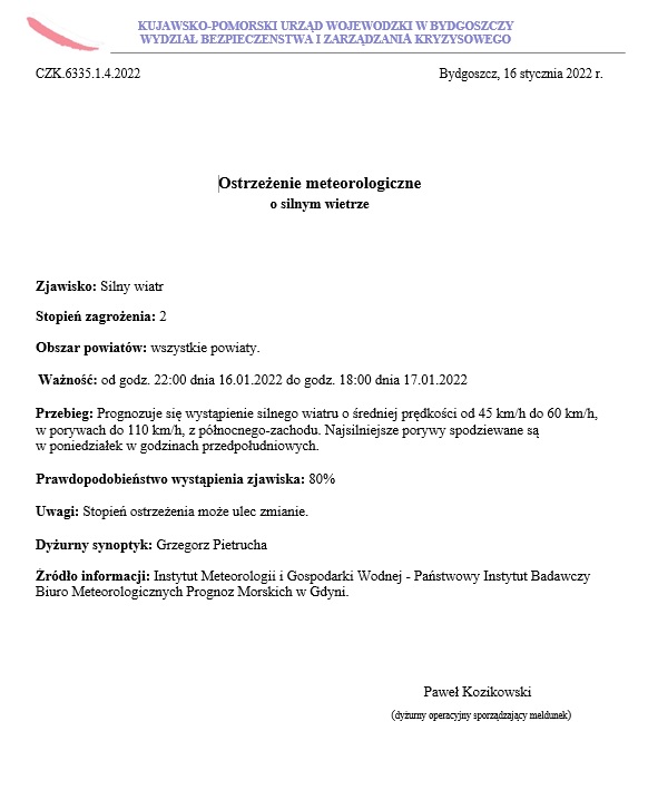 Ostrzeżenie meteorologiczne z dnia 17.01.2022 r. - silny wiatr