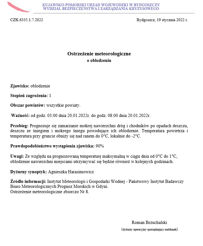 Ostrzeżenie meteorologiczne z dnia 19.01.2022 r. - oblodzenie