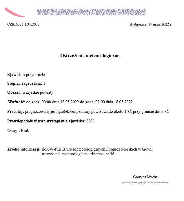 Ostrzeżenie meteorologiczne z dnia 17.05.2022 r. - przymrozki