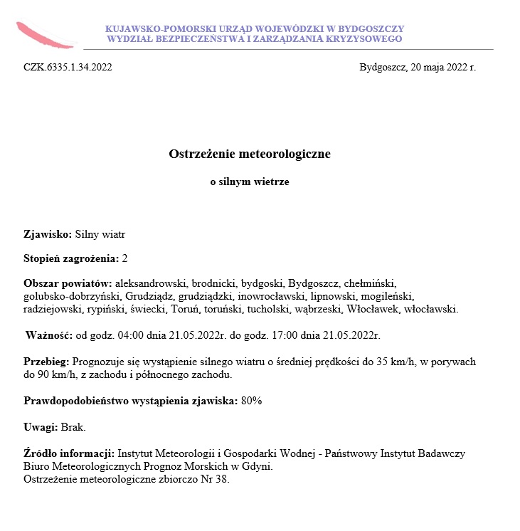 Ostrzeżenie meteorologiczne z dnia 20.05.2022 r. - silny wiatr