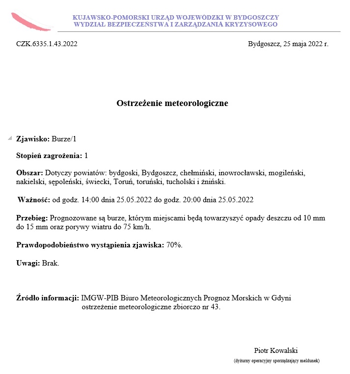 Ostrzeżenie meteorologiczne z dnia 25.05.2022 r. - burze