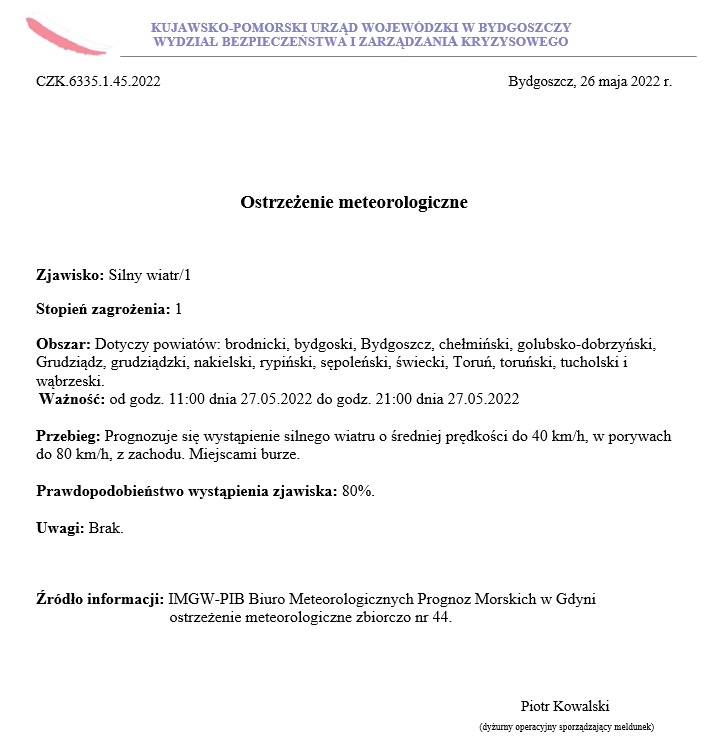 Ostrzeżenie meteorologiczne z dnia 27.05.2022 r. - silny wiatr