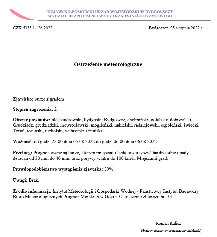 Ostrzeżenie meteorologiczne z dnia 05.08.2022 r. - burze z gradem