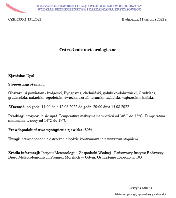 Ostrzeżenie meteorologiczne z dnia 11.08.2022 r. - upał