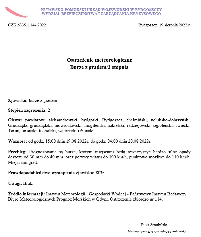 Ostrzeżenie meteorologiczne z dnia 19.08.2022 r. - burze z gradem