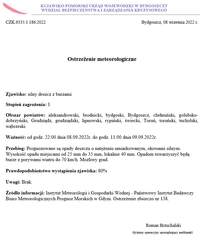 Ostrzeżenie meteorologiczne z dnia 08.09.2022 r. - burze