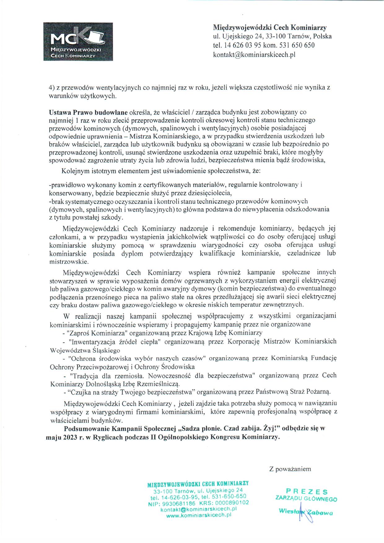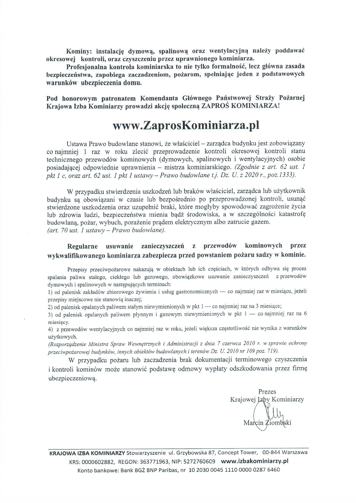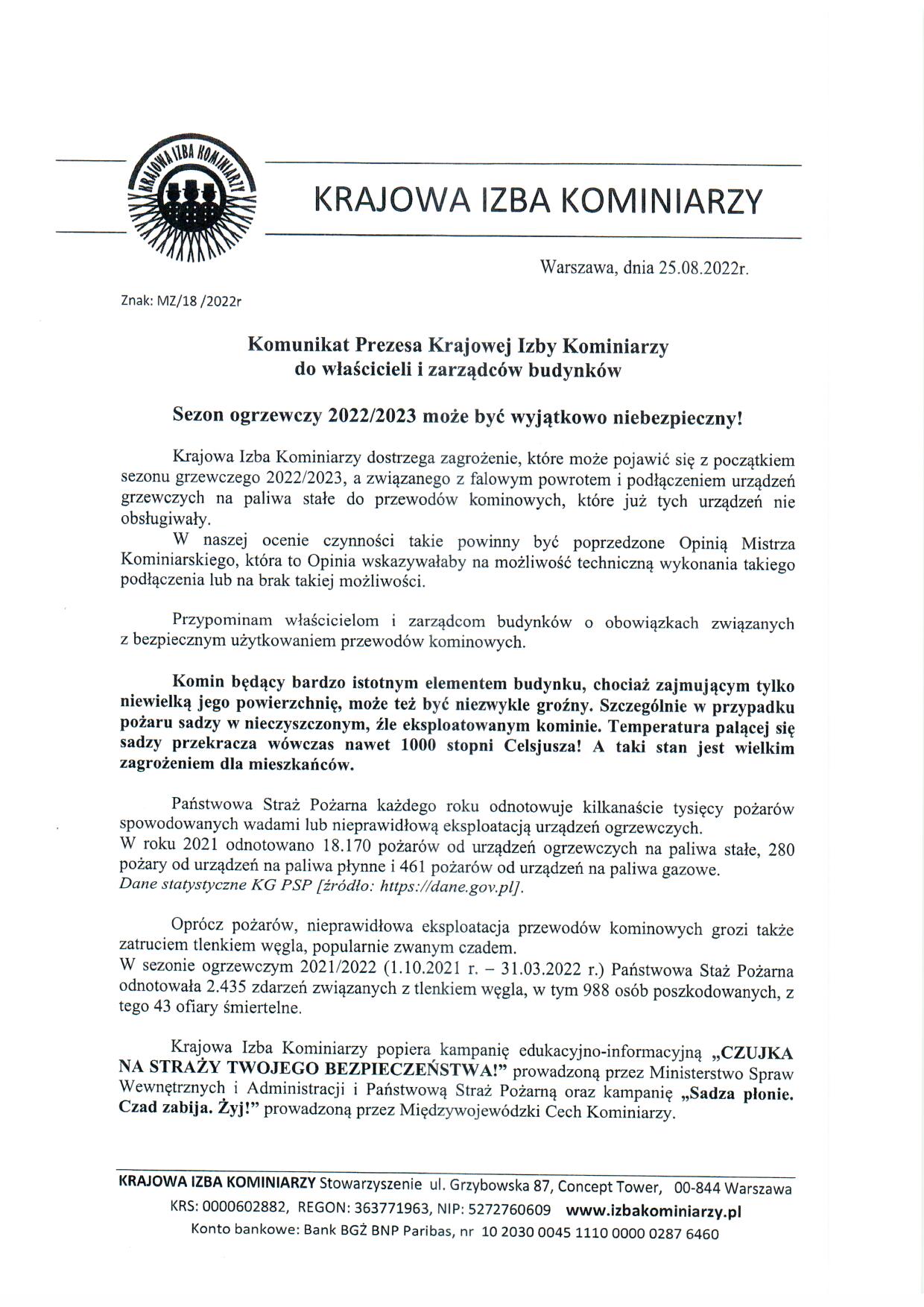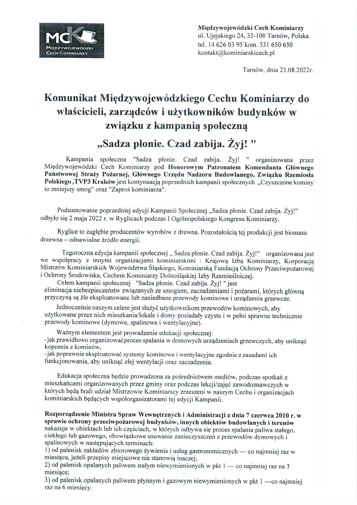 Komunikat Prezesa Krajowej Izby Kominiarzy oraz Międzynarodowego Cechu Kominiarzy do właścicieli, zarządców i użytkowników budynków w związku z kampanią społeczną "Sadza płonie. Czad zabija. Żyj!"