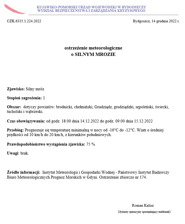 Ostrzeżenie meteorologiczne z dnia 14.12.2022 r. - silny mróz