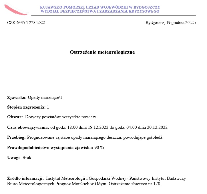Ostrzeżenie meteorologiczne z dnia 19.12.2022 r. - Opady marznące