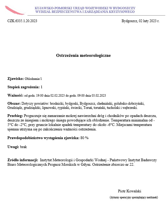 Ostrzeżenie meteorologiczne o oblodzeniu pierwszego stopnia.