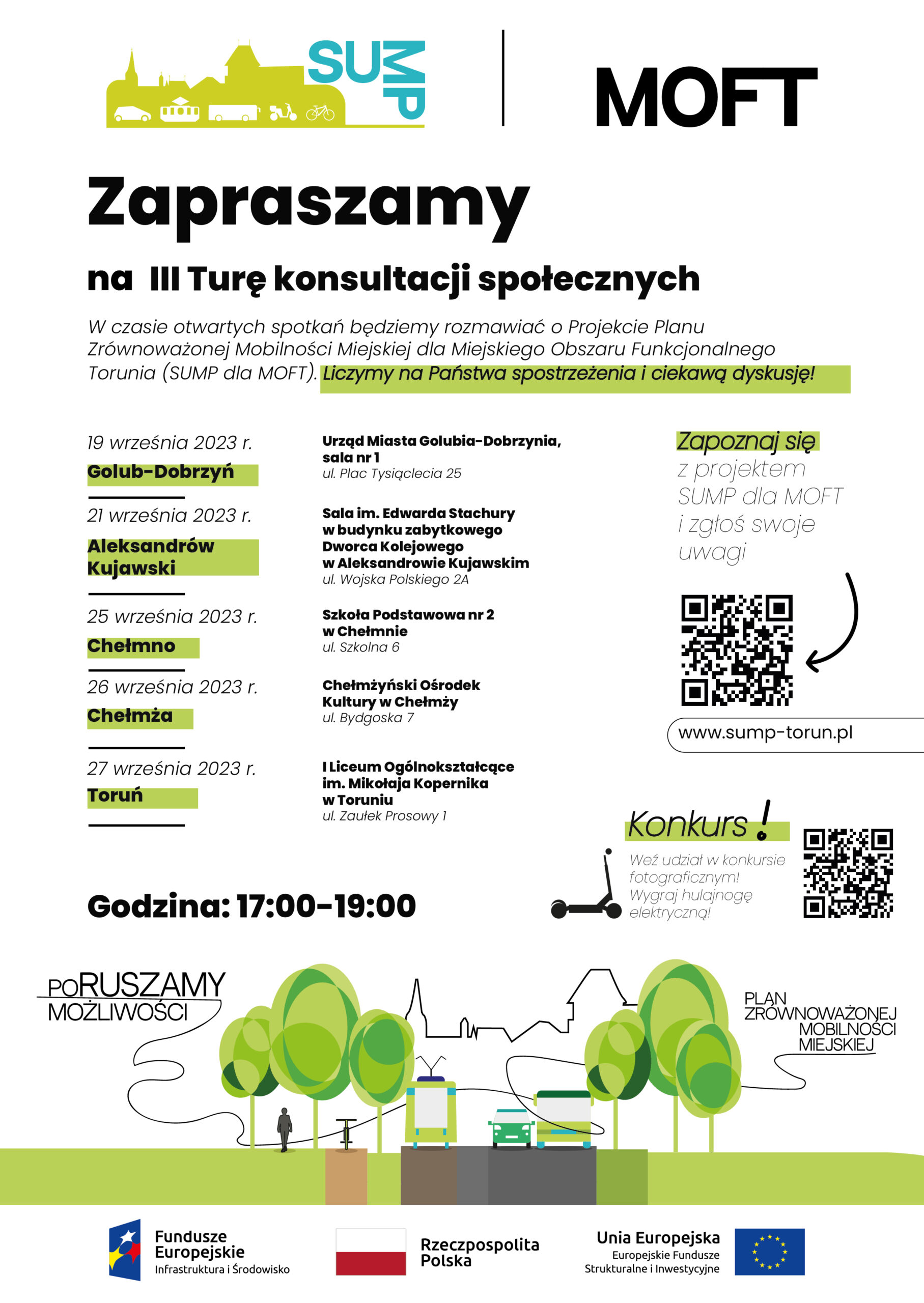 Projekt SUMP dla MOFT zostanie opublikowany na stronie www.sump-torun.pl na około 10 dni przed pierwszym z zaplanowanych spotkań, które odbędzie się 19 września w Golubiu-Dobrzyniu. Zaplanowano łącznie 5 spotkań konsultacyjnych. Dokładne daty i lokalizacje prezentuje poniższa grafika.