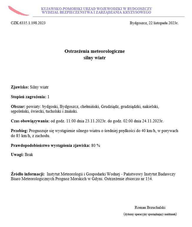 Ostrzeżenie meteorologiczne silny wiatr z dnia 23.11.2023 r.