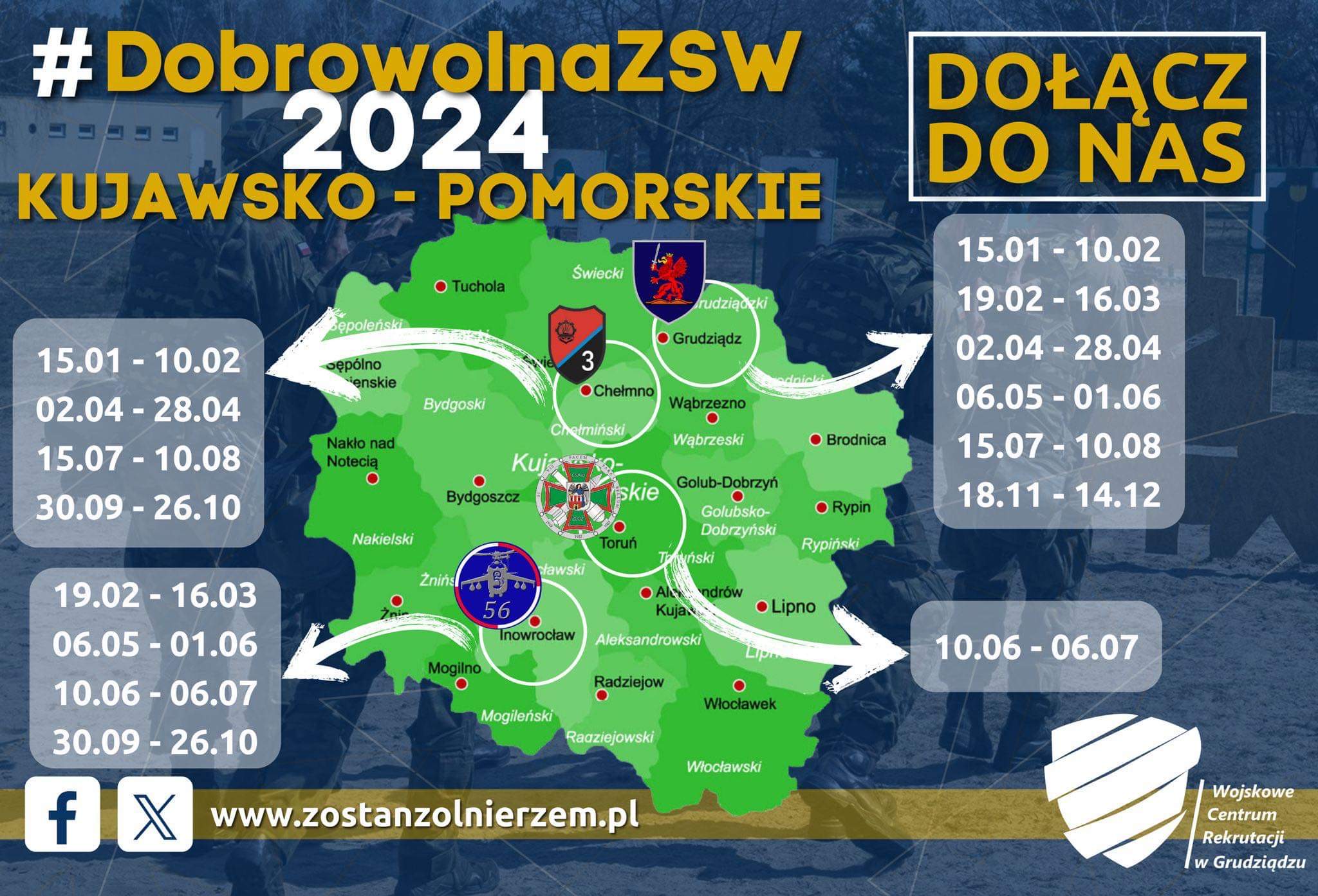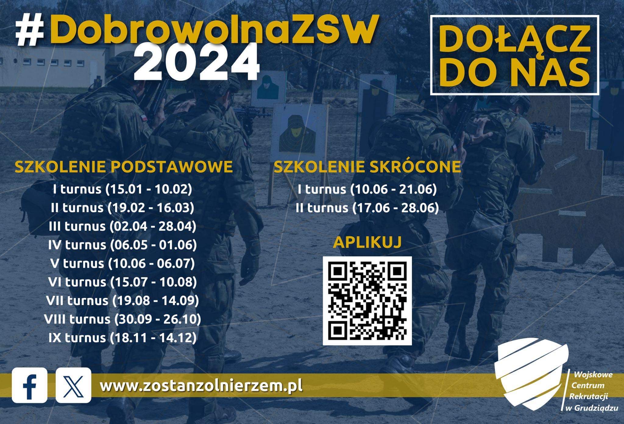 9 grudnia dobiegnie końca ostatni w bieżącym roku, VIII turnus szkolenia podstawowego w ramach Dobrowolnej Zasadniczej Służby Wojskowej, który cieszył się rekordowym zainteresowaniem wśród ochotników składających wnioski do pełnienia służby wojskowej. Ponad 8200 ochotników przekroczyło bramy 84 jednostek wojskowych na terenie całego kraju (w tym ponad 740 ochotników z województwa kujawsko – pomorskiego). Od momentu wejścia w życie ustawy o Obronie Ojczyzny do Dobrowolnej Zasadniczej Służby Wojskowej wstąpiło ponad 42 000 ochotników (zarówno na szkolenie podstawowe, jak i szkolenie specjalistyczne bezpośrednio z pasywnej rezerwy). To pokazuje, jak Wojsko Polskie otworzyło się na oczekiwania społeczeństwa. Kolejny turnus DSZW rozpocznie się 15 stycznia 2024 roku. Ochotników zainteresowanych wstąpieniem w szeregi Wojska Polskiego zapraszamy do kujawsko – pomorskich Wojskowych Centrów Rekrutacji oraz zachęcamy do aplikowania do służby wojskowej za pośrednictwem portalu rekrutacyjnego zostanzolnierzem.pl