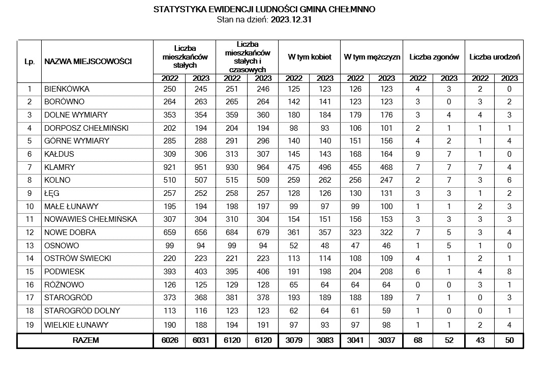 Gmina Chełmno na dzień 31 grudnia 2023 r. liczyła 6031 mieszkańców zameldowanych na pobyt stały. Liczba ludności wzrosła rok do roku zaledwie o pięć osób.