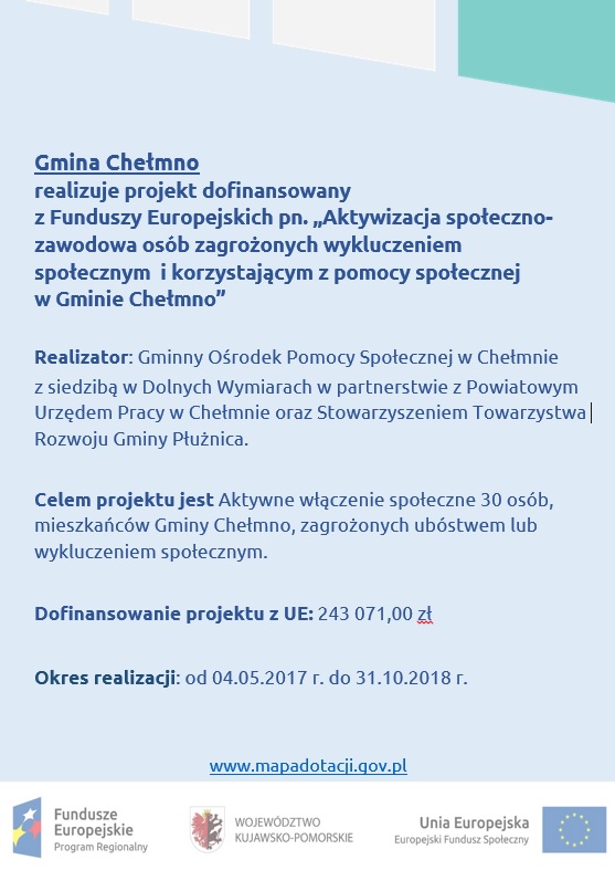 Aktywizacja społeczno- zawodowa osób zagrożonych wykluczeniem społecznym i korzystającym z pomocy społecznej w Gminie Chełmno-projekt realizowany