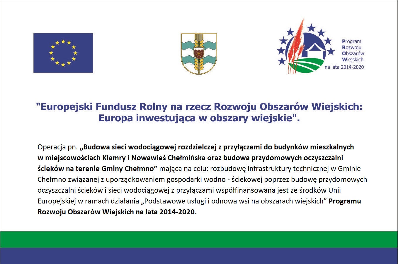 „Budowa sieci wodociągowej rozdzielczej z przyłączami do budynków mieszkalnych w miejscowościach Klamry i Nowawieś Chełmińska oraz budowa przydomowych oczyszczalni ścieków na terenie Gminy Chełmno”